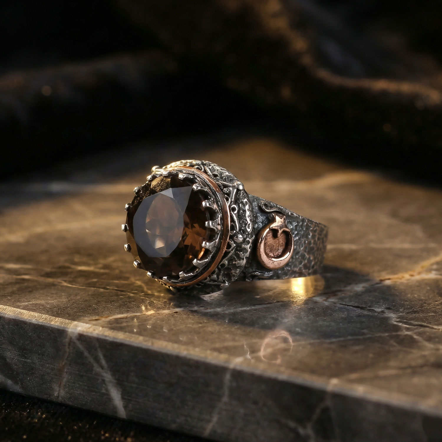 Dumanlı Kuvars Ay Yıldız Sertifikalı Gümüş Yüzük
