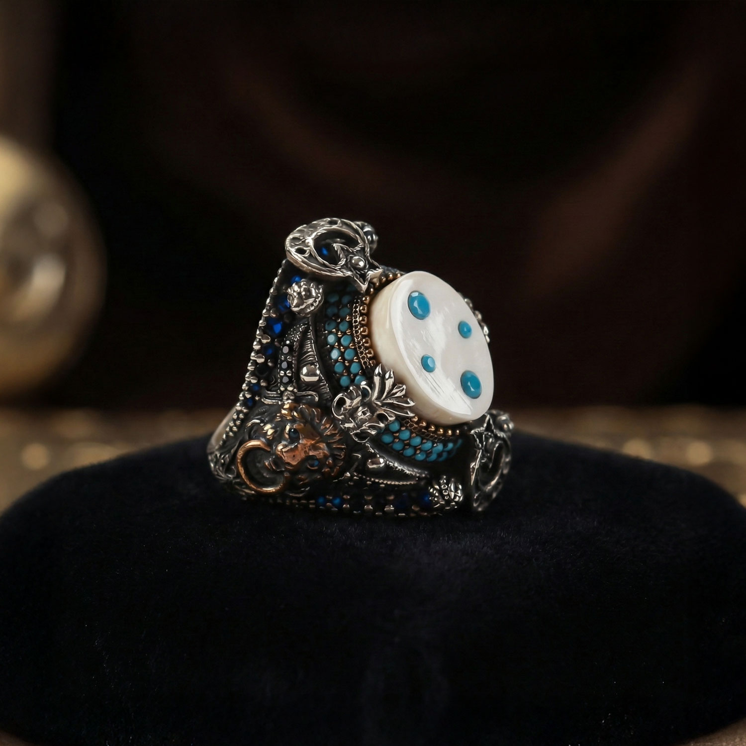 Firuze İşleme Fildişi Taşlı Sancak Yüzük