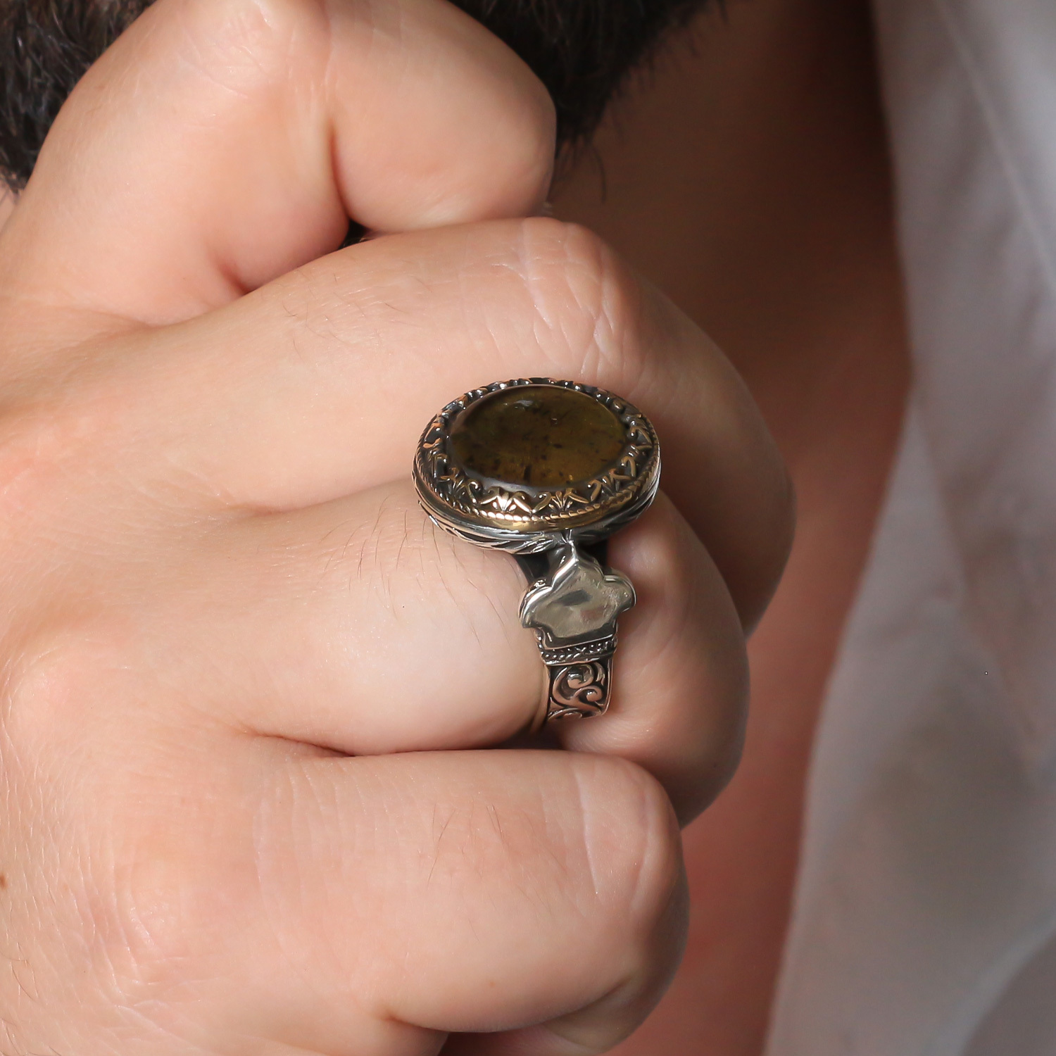 İncelediğiniz yüzükte doğal damla kehribar ve 925 ayar saf gümüş kullanılmıştır.