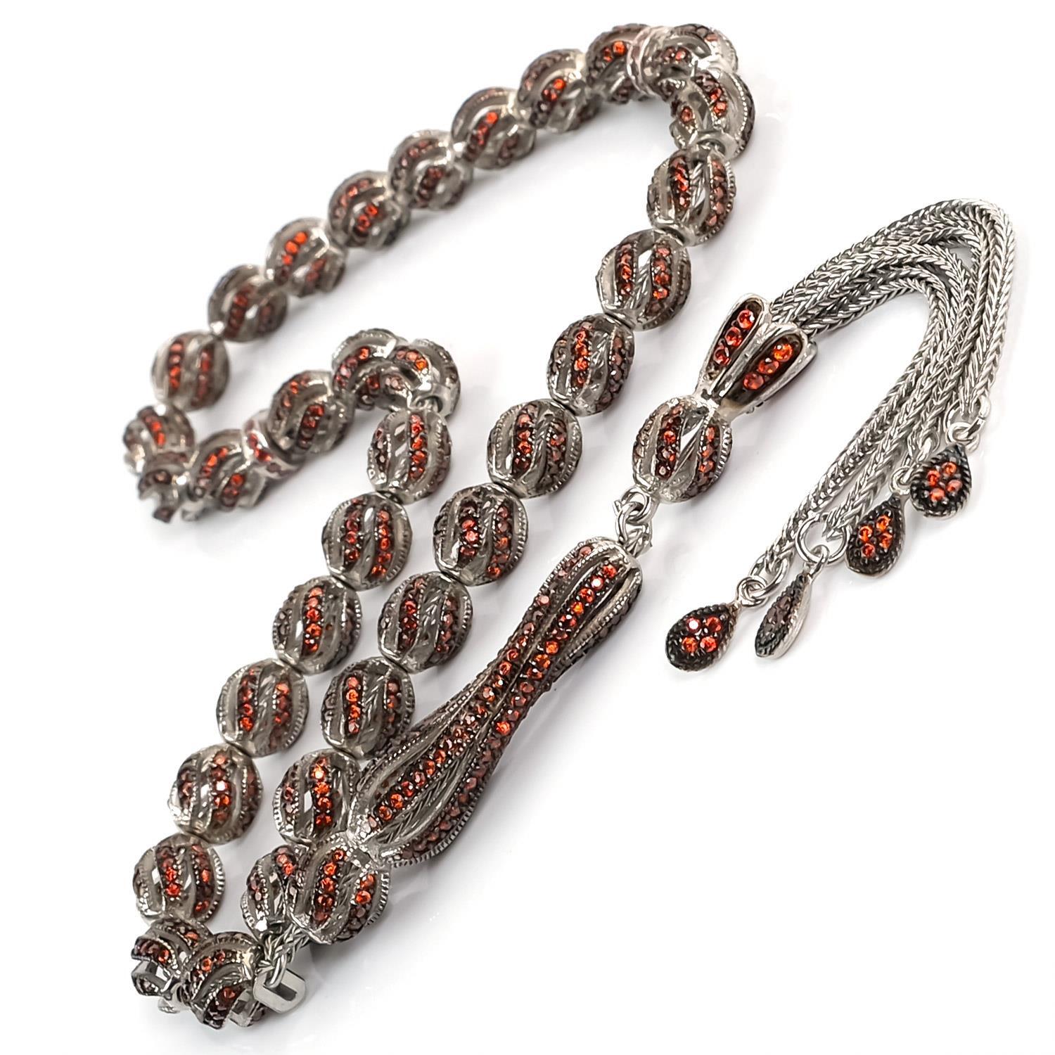 Kırmızı Zirkon Taşlı Özel Tasarım 925 Ayar Gümüş Tesbih