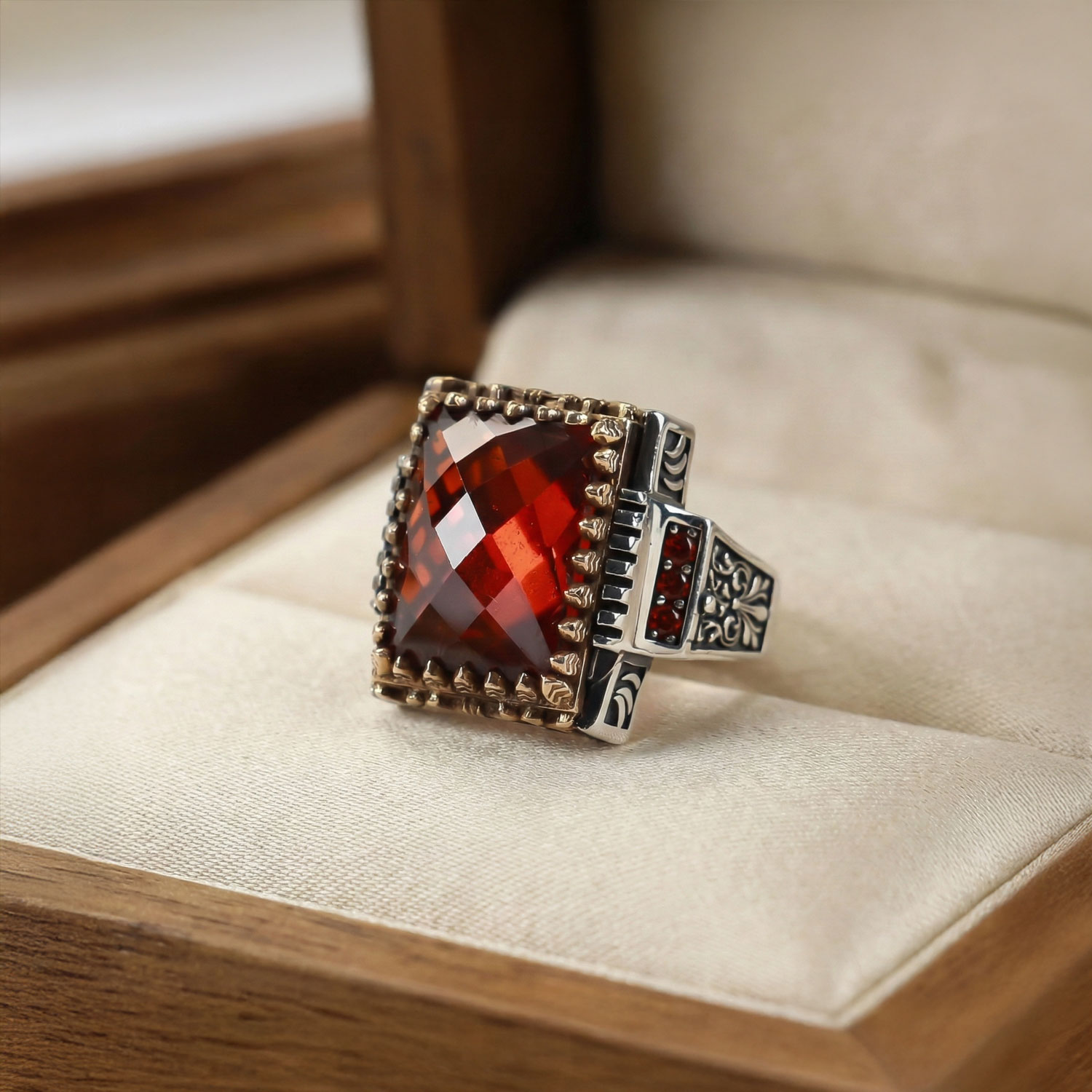 Kızıl Zirkon Gold İşleme Gümüş Yüzük