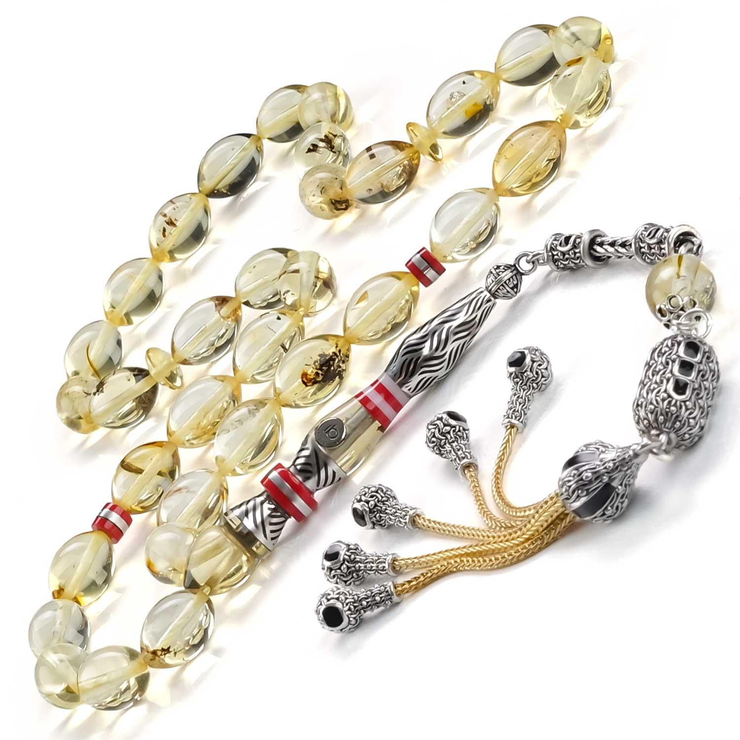 Nakkaş Fosilli Beyzi Su Damlası Has Kehribar Tesbih