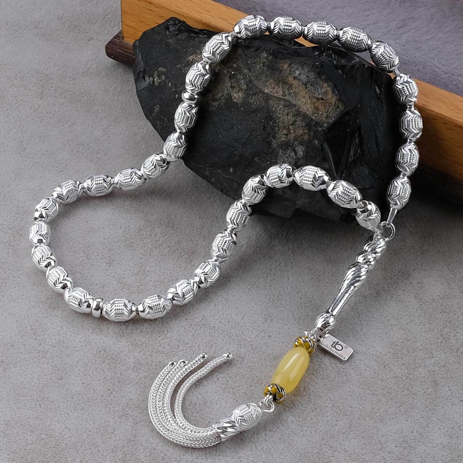 Nokta İşleme Damla Kehribar Tasarım 925 Ayar Gümüş Tesbih