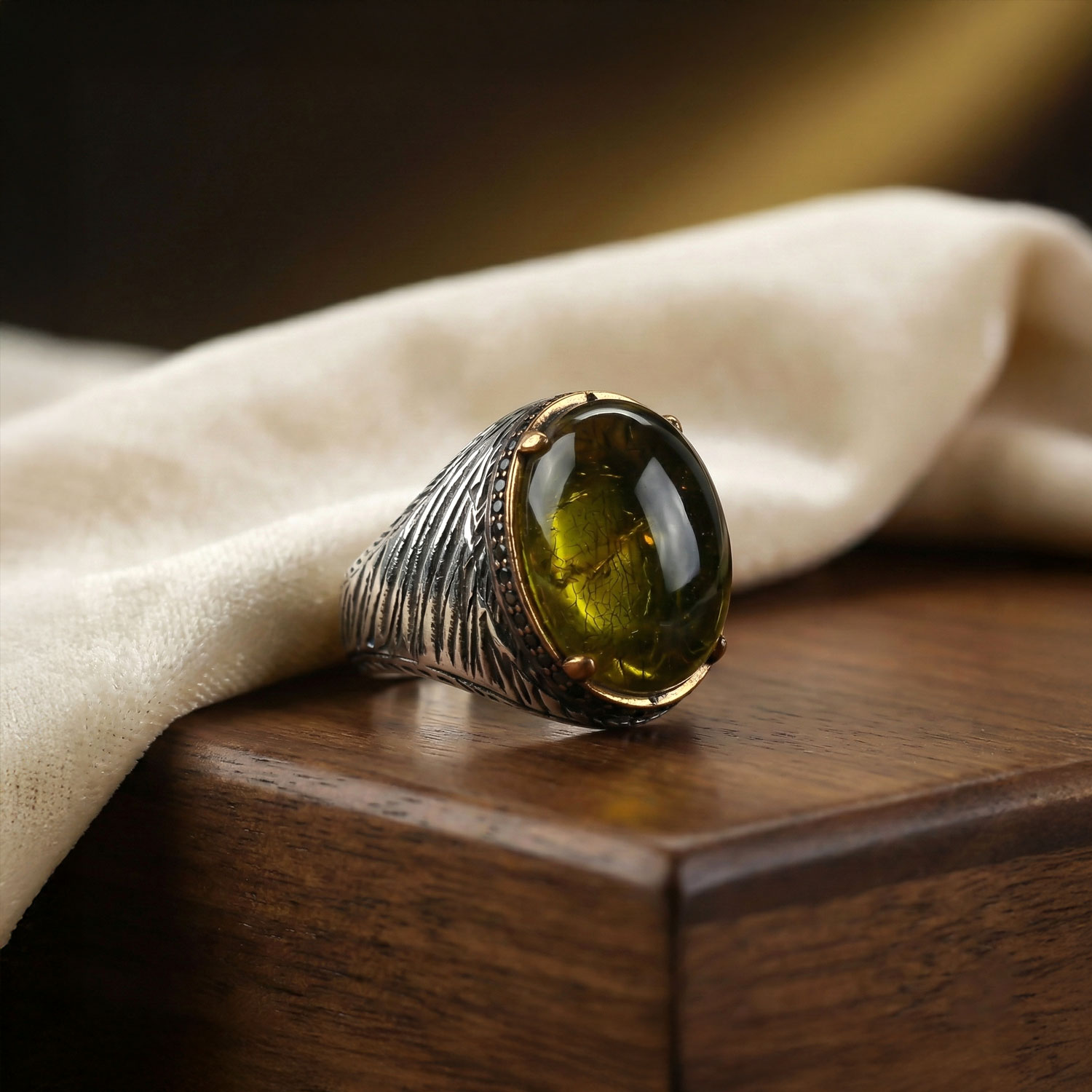 İncelediğiniz yüzükte doğal damla kehribar ve 925 ayar saf gümüş kullanılmıştır.