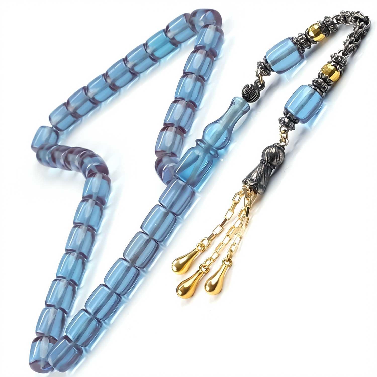 Saydam Mavi Fıçı Kesim Sıkma Kehribar Tesbih
