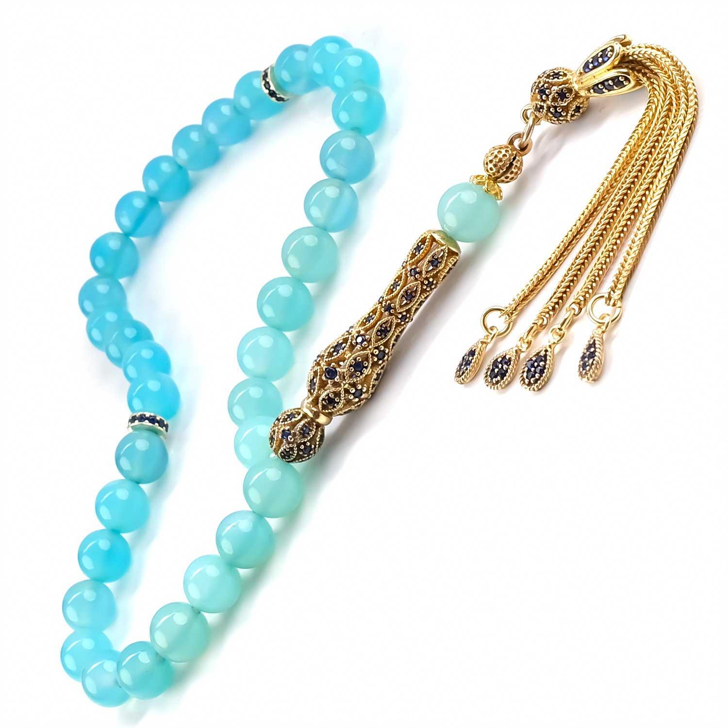 Sky Blue Mavi Akik Zirkon Gümüş Tasarım Doğaltaş Tesbih