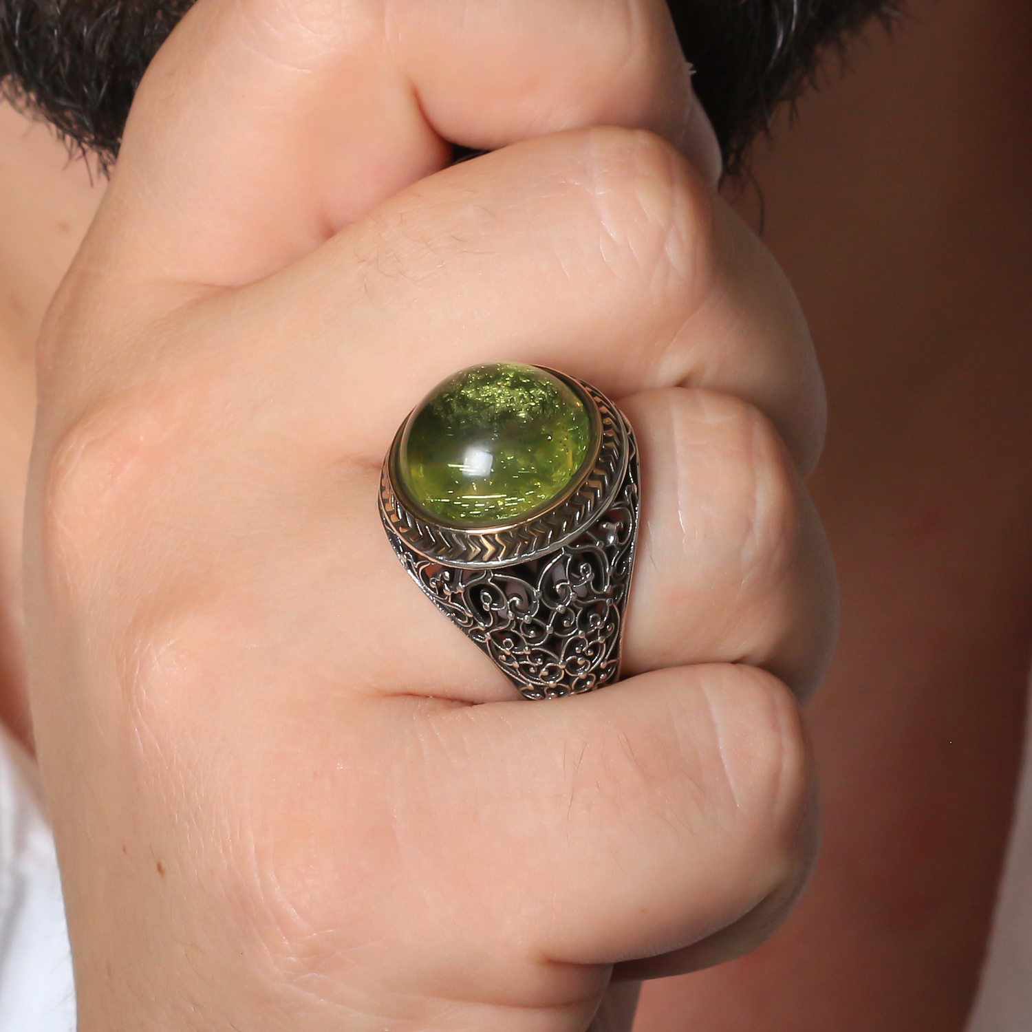 İncelediğiniz yüzükte doğal damla kehribar ve 925 ayar saf gümüş kullanılmıştır.