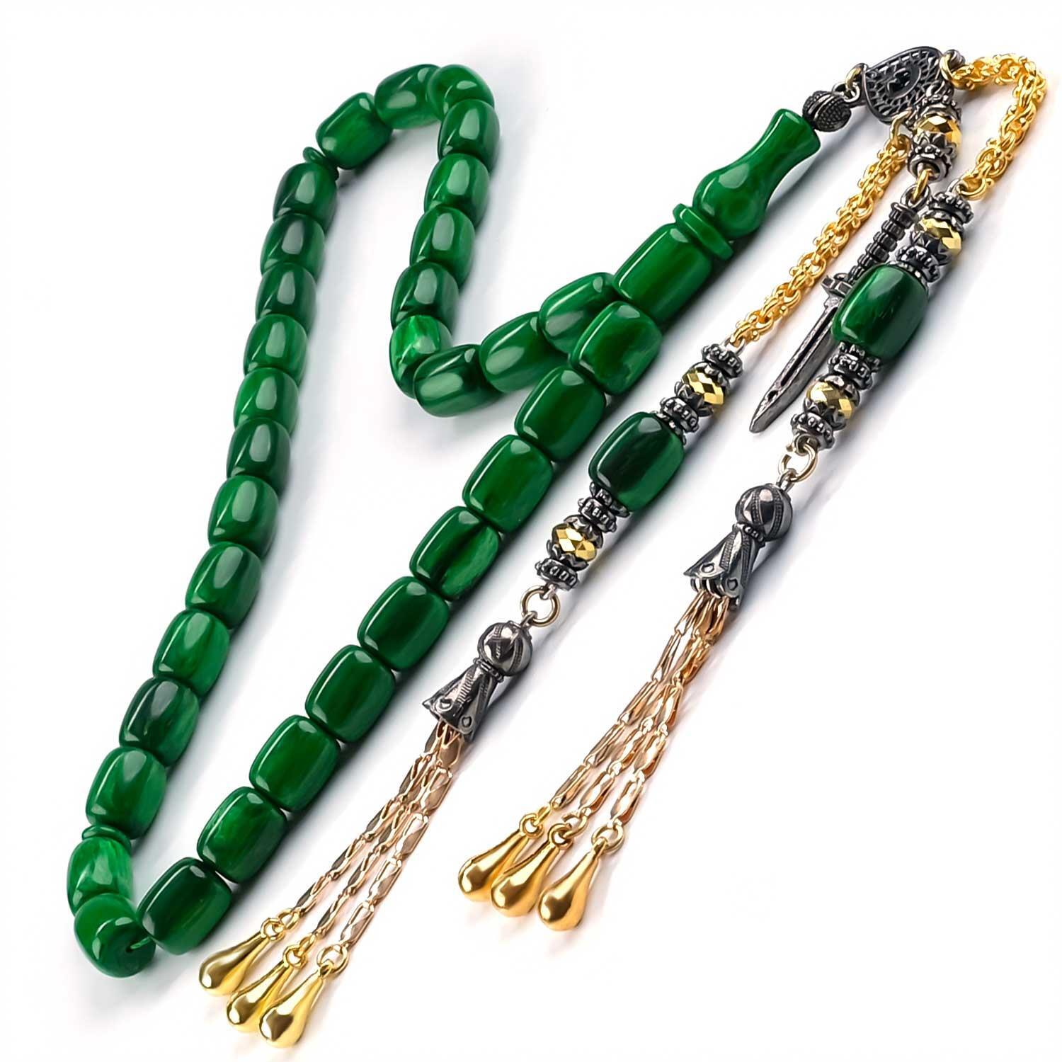 Zümrüt Yeşili Çift Püskül Hareli Sıkma Kehribar Tesbih